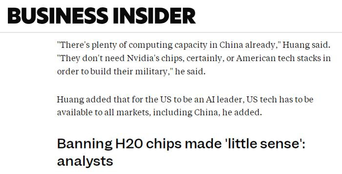 美国《商业内幕》网站的报道说,消息发布后,在英伟达供应链集中的亚洲股市、中国股市都表现出了积极反应。报道说,黄仁勋此前在接受美国有线电视新闻网的采访时曾说,中国已具备足够的算力,他们并不需要“依赖”英伟达的芯片。如果美国想要成为人工智能领域的领导者,就必须向包括中国在内的所有市场提供技术。